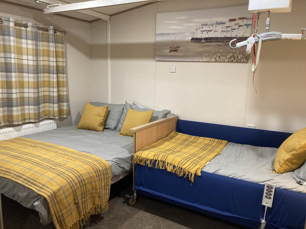 Master bedrooms feature a ceiling hoist, mobile hoist, single profiling bed and double bed, as well as a large wetroom with plenty of grab rails, wheel-under basin and tilt-in-space shower chair commode. A second bedroom features two single beds.